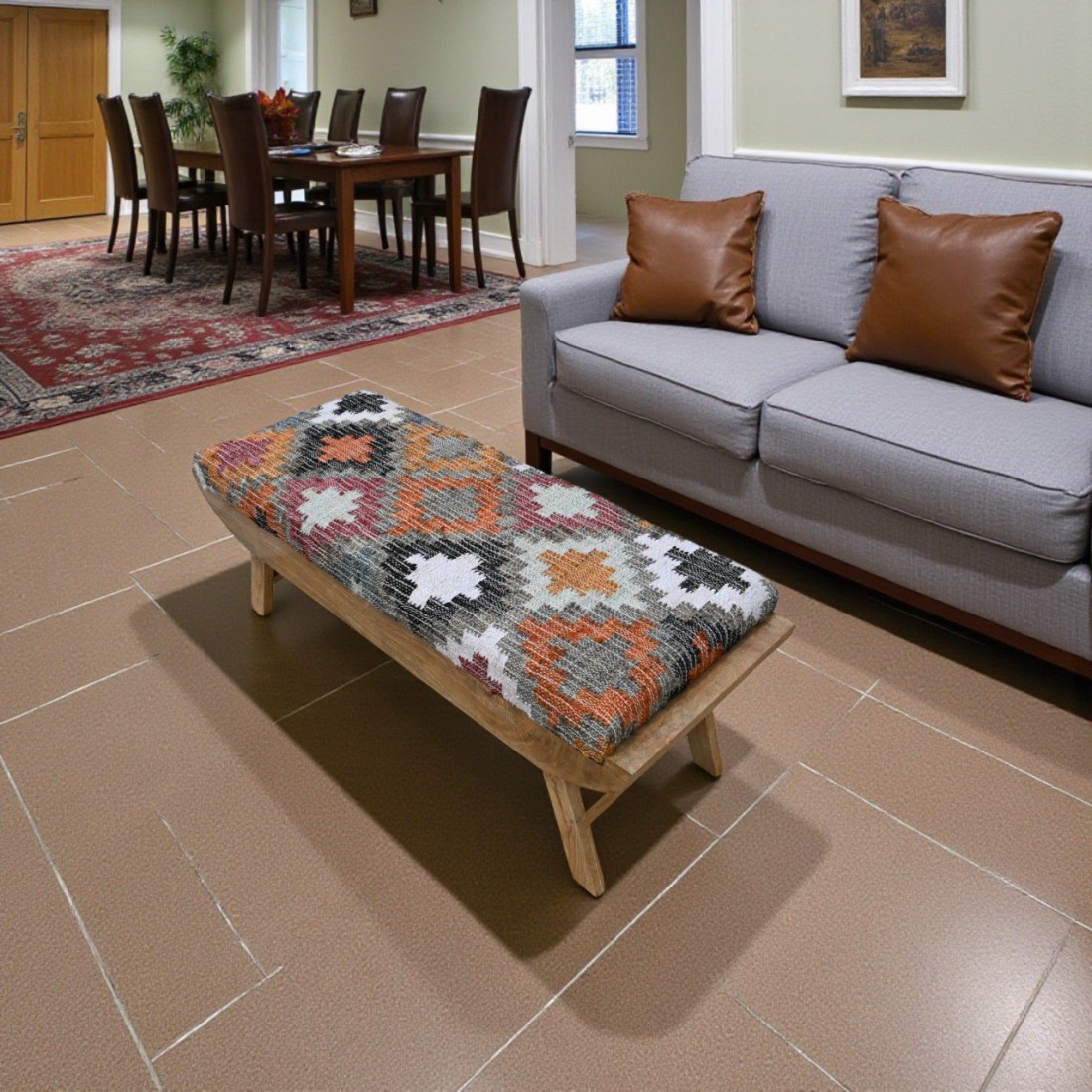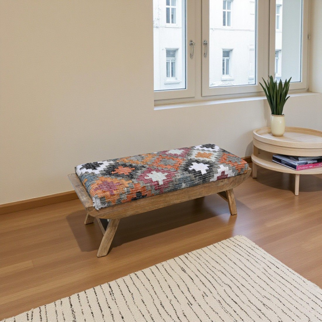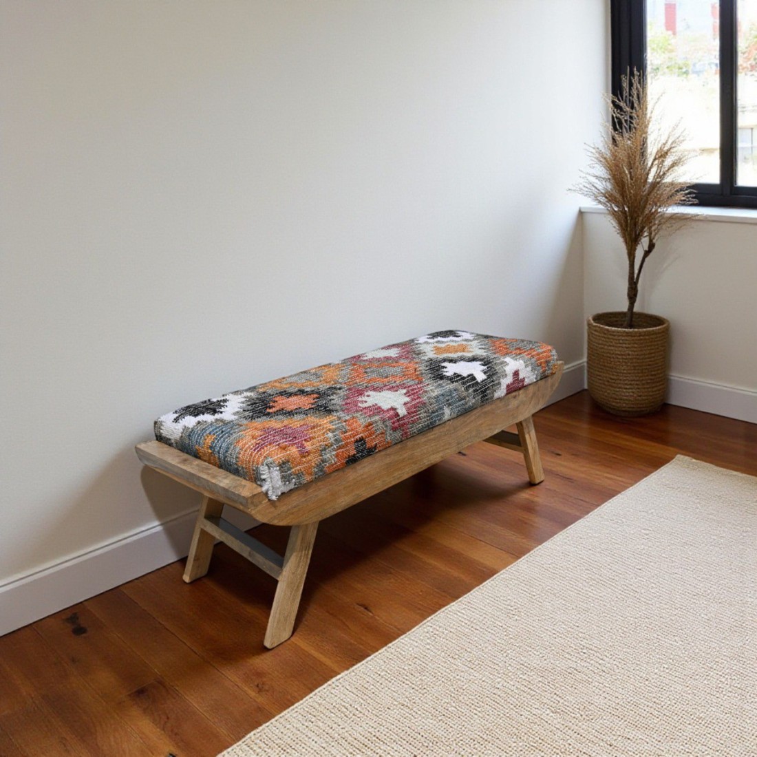 An Eye Catching Look Handcrafted Rug Upholstered Wooden Bench for Your Living Room, Entryway. This Wooden Bench Made by High Quality Wood With Handmade Rug Fabric, Which Developed By Our Local Artisans.