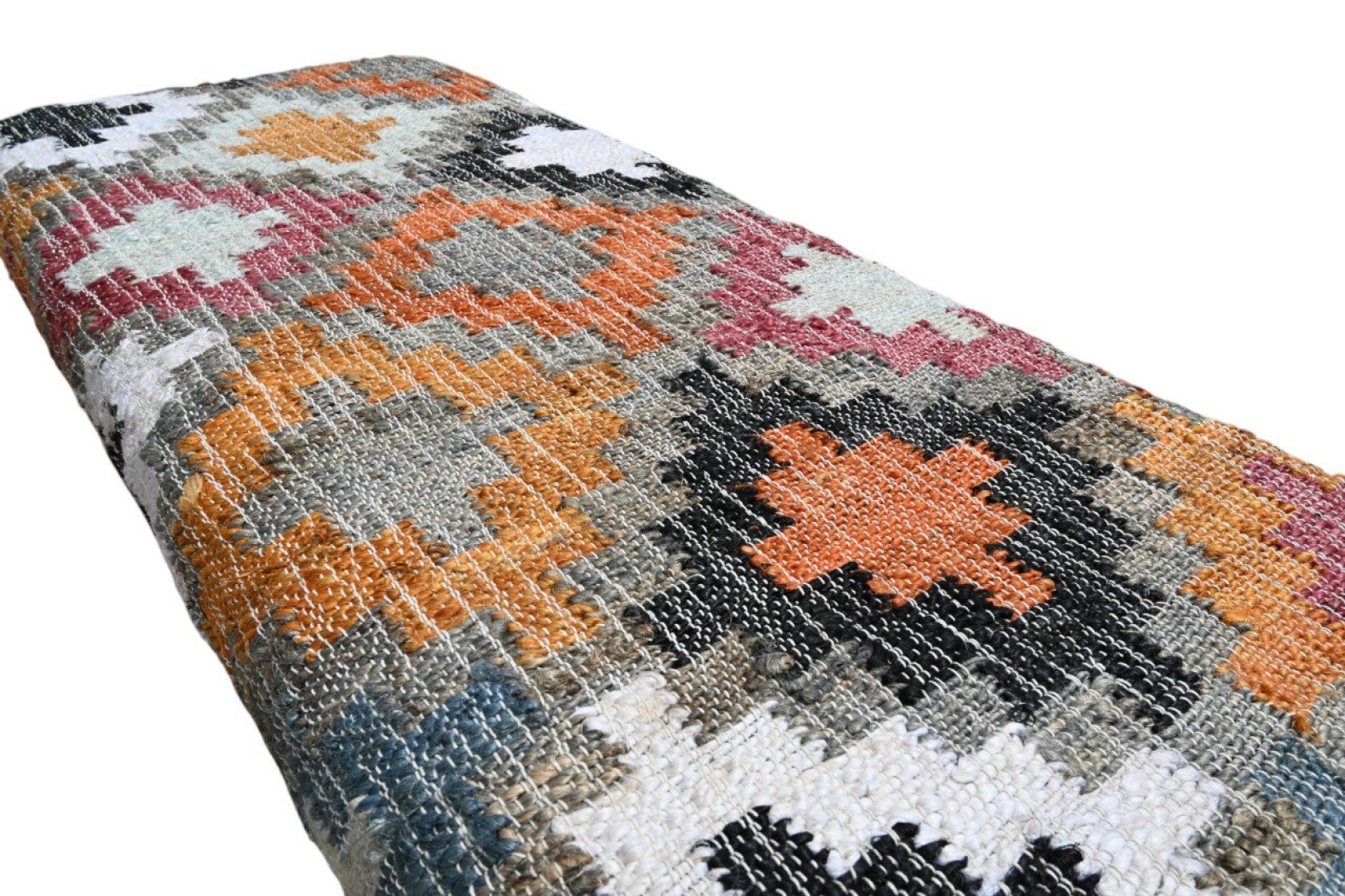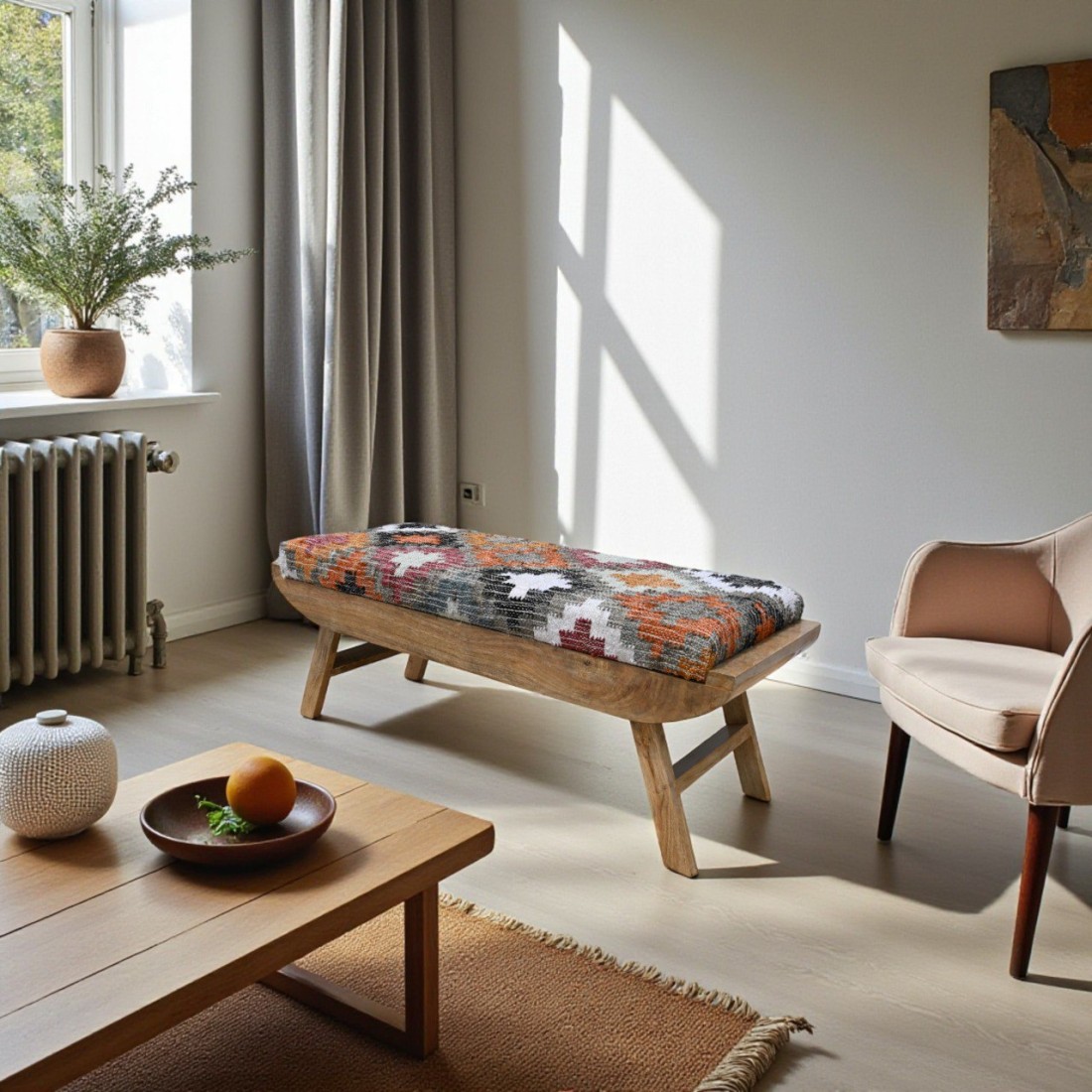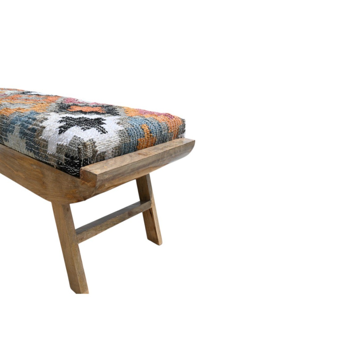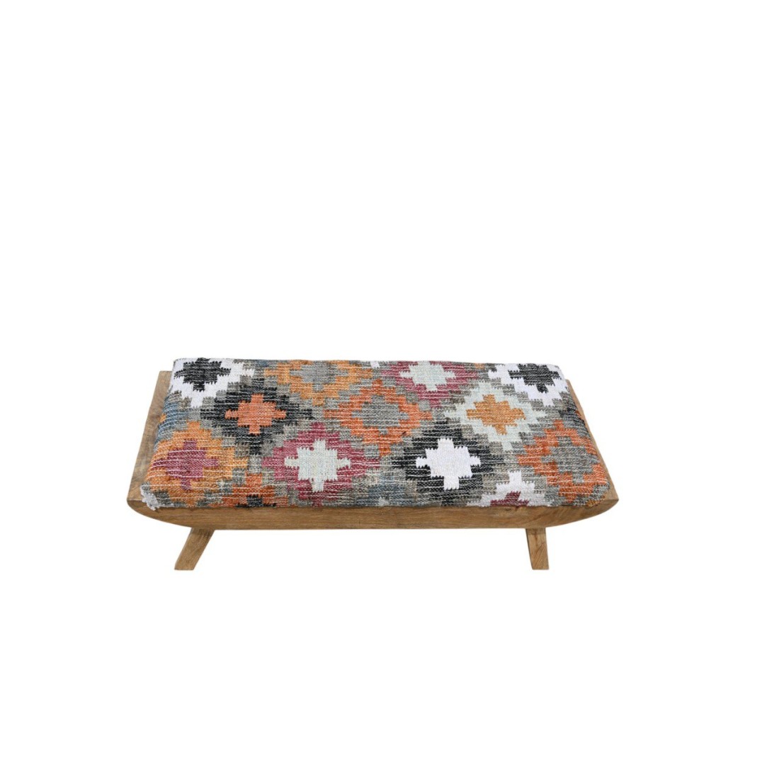 An Eye Catching Look Handcrafted Rug Upholstered Wooden Bench for Your Living Room, Entryway. This Wooden Bench Made by High Quality Wood With Handmade Rug Fabric, Which Developed By Our Local Artisans.